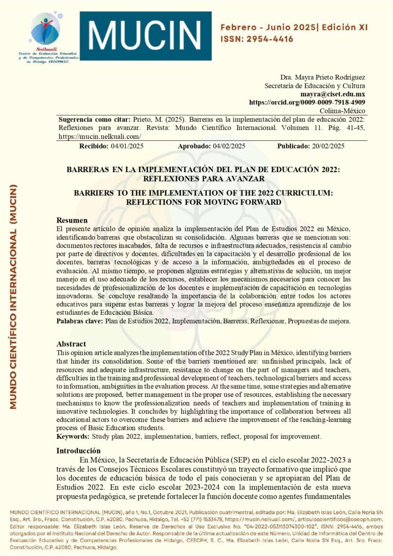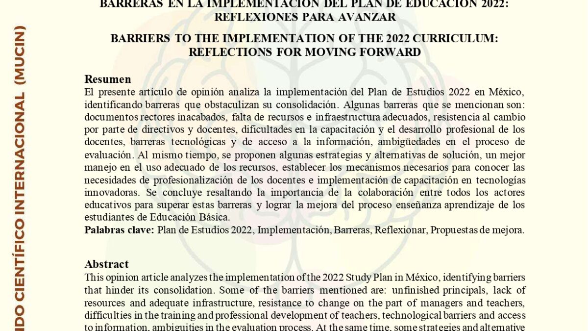 El presente artículo de opinión analiza la implementación del Plan de Estudios 2022 en México, identificando barreras que obstaculizan su consolidación. Algunas barreras que se mencionan son: documentos rectores inacabados, falta de recursos e infraestructura adecuados, resistencia al cambio por parte de directivos y docentes, dificultades en la capacitación y el desarrollo profesional de los docentes, barreras tecnológicas y de acceso a la información, ambigüedades en el proceso de evaluación. Al mismo tiempo, se proponen algunas estrategias y alternativas de solución, un mejor manejo en el uso adecuado de los recursos, establecer los mecanismos necesarios para conocer las necesidades de profesionalización de los docentes e implementación de capacitación en tecnologías innovadoras. Se concluye resaltando la importancia de la colaboración entre todos los actores educativos para superar estas barreras y lograr la mejora del proceso enseñanza aprendizaje de los estudiantes de Educación Básica.
