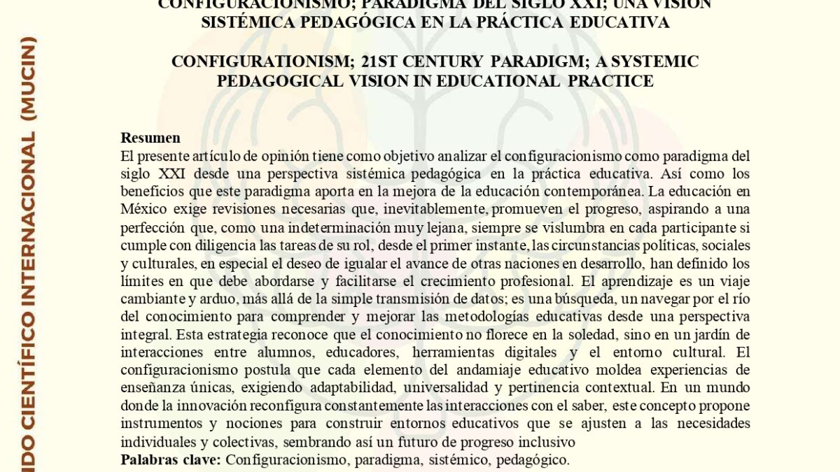 El presente artículo de opinión tiene como objetivo analizar el configuracionismo como paradigma del siglo XXI desde una perspectiva sistémica pedagógica en la práctica educativa. Así como los beneficios que este paradigma aporta en la mejora de la educación contemporánea. La educación en México exige revisiones necesarias que, inevitablemente, promueven el progreso, aspirando a una perfección que, como una indeterminación muy lejana, siempre se vislumbra en cada participante si cumple con diligencia las tareas de su rol, desde el primer instante, las circunstancias políticas, sociales y culturales, en especial el deseo de igualar el avance de otras naciones en desarrollo, han definido los límites en que debe abordarse y facilitarse el crecimiento profesional. El aprendizaje es un viaje cambiante y arduo, más allá de la simple transmisión de datos; es una búsqueda, un navegar por el río del conocimiento para comprender y mejorar las metodologías educativas desde una perspectiva integral. Esta estrategia reconoce que el conocimiento no florece en la soledad, sino en un jardín de interacciones entre alumnos, educadores, herramientas digitales y el entorno cultural. El configuracionismo postula que cada elemento del andamiaje educativo moldea experiencias de enseñanza únicas, exigiendo adaptabilidad, universalidad y pertinencia contextual. En un mundo donde la innovación reconfigura constantemente las interacciones con el saber, este concepto propone instrumentos y nociones para construir entornos educativos que se ajusten a las necesidades individuales y colectivas, sembrando así un futuro de progreso inclusivo