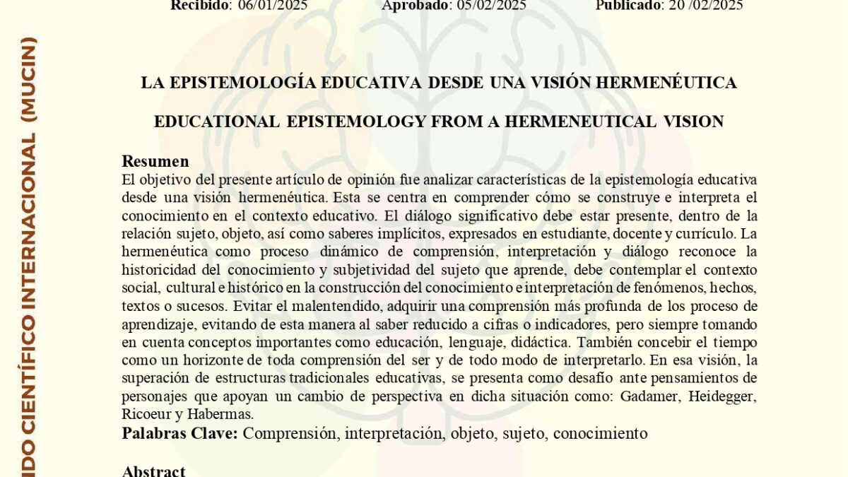 The objective of this opinion article was to analyze characteristics of educational epistemology from a hermeneutical perspective. This focuses on understanding how knowledge is constructed and interpreted in the educational context. Meaningful dialogue must be present, within the subject, object, as well as implicit knowledge, expressed in student, teacher and curriculum. Hermeneutics as a dynamic process of understanding, interpretation and dialogue recognizes the historicity of knowledge and subjectivity of the subject who learns, it must contemplate the social, cultural and historical context in the construction of knowledge and interpretation of phenomena, facts, texts or events. Avoid misunderstanding, acquire a deeper understanding of the learning process, thus avoiding knowledge reduced to figures or indicators, but always taking into account important concepts such as education, language, and didactics. Also conceiving time as a horizon of every understanding of being and of every way of interpreting it. In this vision, the overcoming of traditional educational structures is presented as a challenge to the thoughts of characters who support a change of perspective in such a situation, such as Gadamer, Heidegger, Ricoeur and Habermas.