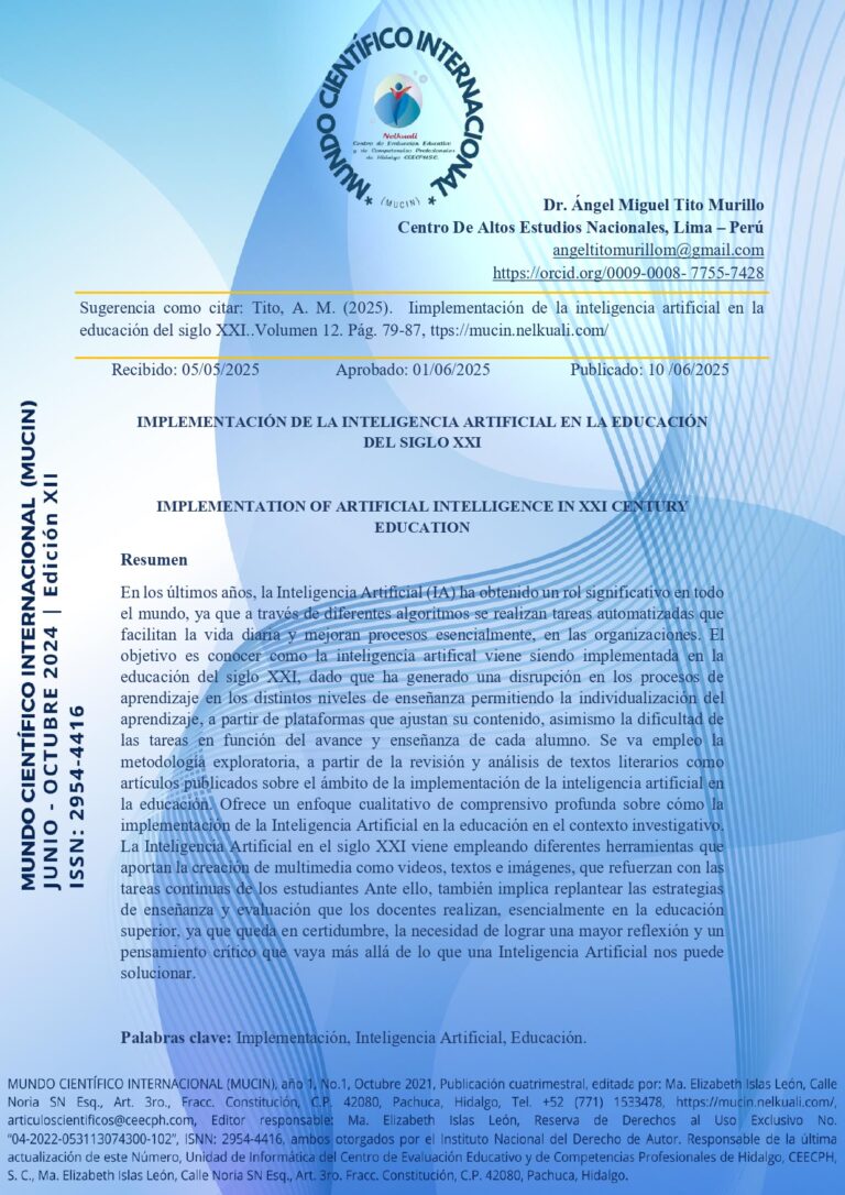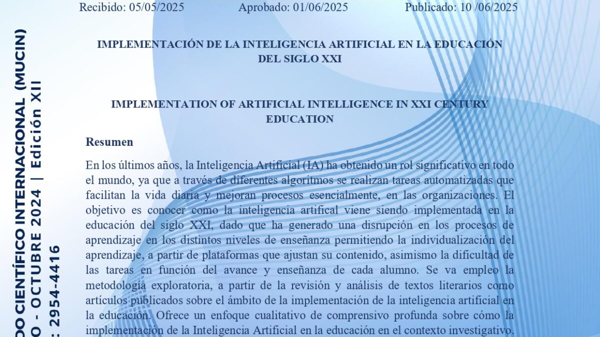 En los últimos años, la Inteligencia Artificial (IA) ha obtenido un rol significativo en todo el mundo, ya que a través de diferentes algoritmos se realizan tareas automatizadas que facilitan la vida diaria y mejoran procesos esencialmente, en las organizaciones. El objetivo es conocer como la inteligencia artifical viene siendo implementada en la educación del siglo XXI, dado que ha generado una disrupción en los procesos de aprendizaje en los distintos niveles de enseñanza permitiendo la individualización del aprendizaje, a partir de plataformas que ajustan su contenido, asimismo la dificultad de las tareas en función del avance y enseñanza de cada alumno. Se va empleo la metodología exploratoria, a partir de la revisión y análisis de textos literarios como artículos publicados sobre el ámbito de la implementación de la inteligencia artificial en la educación. Ofrece un enfoque cualitativo de comprensivo profunda sobre cómo la implementación de la Inteligencia Artificial en la educación en el contexto investigativo. La Inteligencia Artificial en el siglo XXI viene empleando diferentes herramientas que aportan la creación de multimedia como videos, textos e imágenes, que refuerzan con las tareas continuas de los estudiantes Ante ello, también implica replantear las estrategias de enseñanza y evaluación que los docentes realizan, esencialmente en la educación superior, ya que queda en certidumbre, la necesidad de lograr una mayor reflexión y un pensamiento crítico que vaya más allá de lo que una Inteligencia Artificial nos puede solucionar.