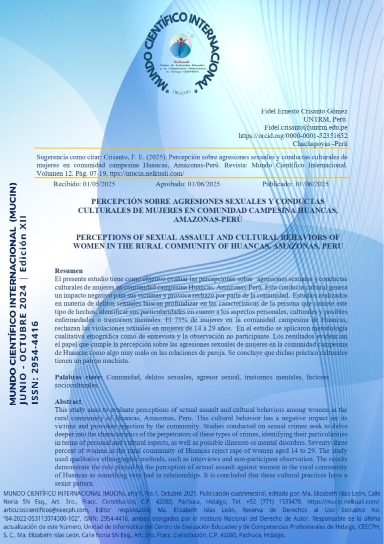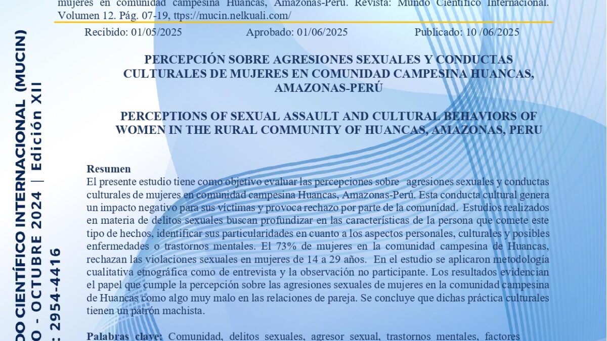 El presente estudio tiene como objetivo evaluar las percepciones sobre   agresiones sexuales y conductas culturales de mujeres en comunidad campesina Huancas, Amazonas-Perú. Esta conducta cultural genera un impacto negativo para sus víctimas y provoca rechazo por parte de la comunidad.  Estudios realizados en materia de delitos sexuales buscan profundizar en las características de la persona que comete este tipo de hechos, identificar sus particularidades en cuanto a los aspectos personales, culturales y posibles enfermedades o trastornos mentales. El 73% de mujeres en la comunidad campesina de Huancas, rechazan las violaciones sexuales en mujeres de 14 a 29 años.  En el estudio se aplicaron metodología cualitativa etnográfica como de entrevista y la observación no participante. Los resultados evidencian el papel que cumple la percepción sobre las agresiones sexuales de mujeres en la comunidad campesina de Huancas como algo muy malo en las relaciones de pareja. Se concluye que dichas práctica culturales tienen un patrón machista.