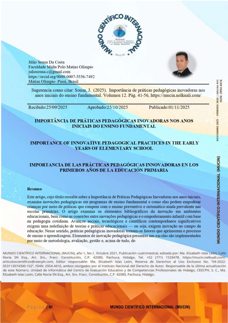 Este artigo, cujo título ressalta sobre a Importância de Práticas Pedagógicas Inovadoras nos anos iniciais, examina inovações pedagógicas em programas de ensino fundamental e como elas podem empoderar crianças por meio de práticas que rompem com o ensino preventivo e sistemático ainda prevalente nas escolas primárias. O artigo examina os elementos bibliográficos da inovação em ambientes educacionais, bem como as conexões entre inovações pedagógicas e o empoderamento infantil com base na pedagogia cotidiana. Avanços sociais, tecnológicos e científicos contemporâneos significativos exigem uma redefinição de teorias e práticas educacionais — ou seja, exigem inovação no campo da educação. Nesse sentido, práticas pedagógicas inovadoras tornam-se fatores que aprimoram o processo de ensino e aprendizagem. Elementos de inovação pedagógica presentes nas escolas são implementados por meio de metodologia, avaliação, gestão e, acima de tudo, do currículo de uma determinada instituição. A discussão sobre inovação pedagógica foi outro tópico importante que deu início a um debate com foco não apenas nas tecnologias digitais modernas, mas também nas práticas pedagógicas cotidianas, transformando abordagens de ensino e aprendizagem, rompendo com processos sistemáticos de aprendizagem e, acima de tudo, empoderando as crianças na vida cotidiana.