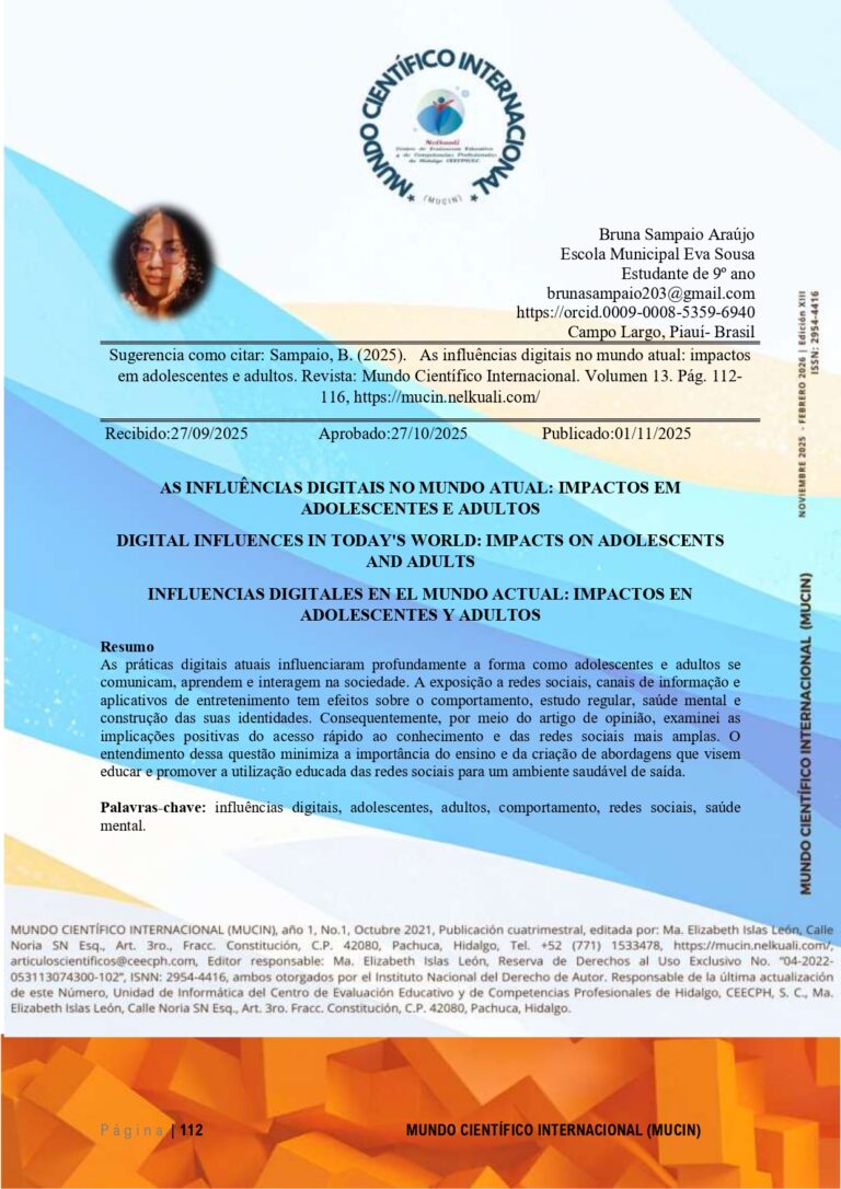 As práticas digitais atuais influenciaram profundamente a forma como adolescentes e adultos se comunicam, aprendem e interagem na sociedade. A exposição a redes sociais, canais de informação e aplicativos de entretenimento tem efeitos sobre o comportamento, estudo regular, saúde mental e construção das suas identidades. Consequentemente, por meio do artigo de opinião, examinei as implicações positivas do acesso rápido ao conhecimento e das redes sociais mais amplas. O entendimento dessa questão minimiza a importância do ensino e da criação de abordagens que visem educar e promover a utilização educada das redes sociais para um ambiente saudável de saída.