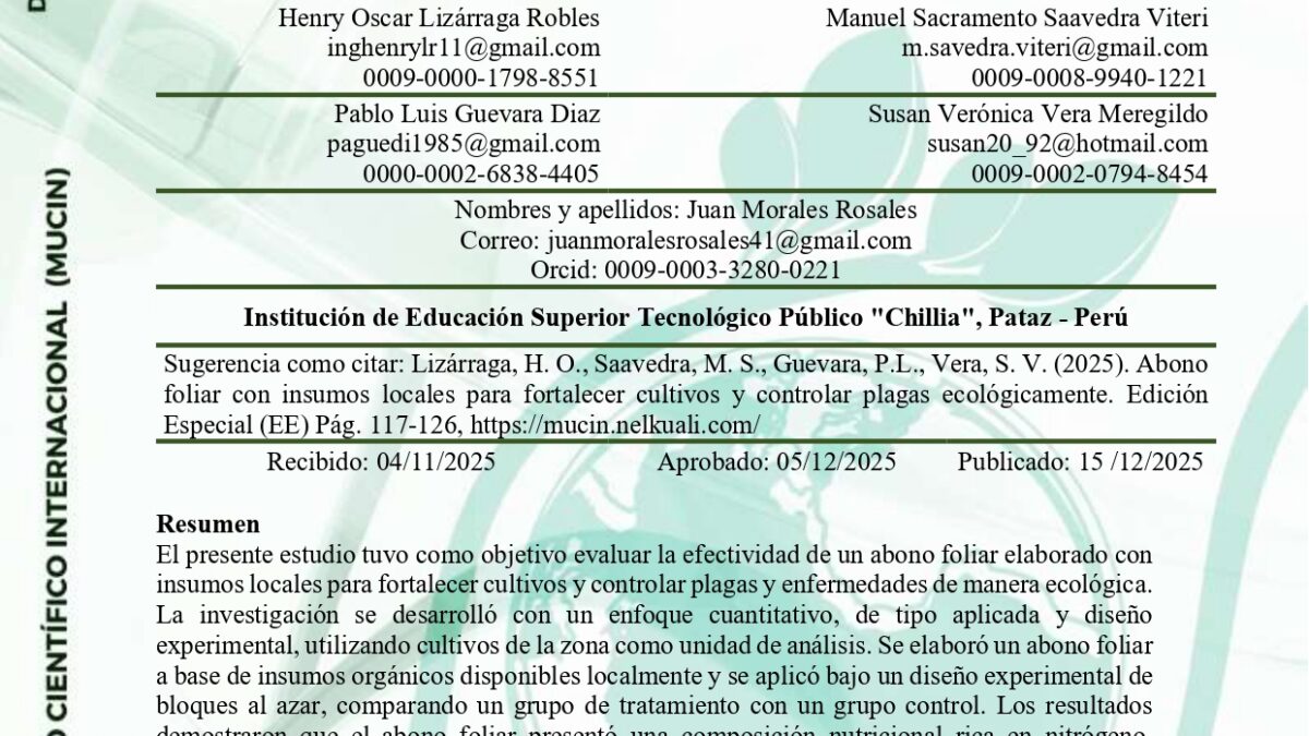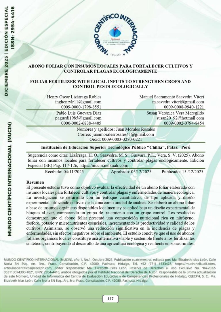 El presente estudio tuvo como objetivo evaluar la efectividad de un abono foliar elaborado con insumos locales para fortalecer cultivos y controlar plagas y enfermedades de manera ecológica. La investigación se desarrolló con un enfoque cuantitativo, de tipo aplicada y diseño experimental, utilizando cultivos de la zona como unidad de análisis. Se elaboró un abono foliar a base de insumos orgánicos disponibles localmente y se aplicó bajo un diseño experimental de bloques al azar, comparando un grupo de tratamiento con un grupo control. Los resultados demostraron que el abono foliar presentó una composición nutricional rica en nitrógeno, fósforo, potasio y micronutrientes esenciales, incrementando la productividad y calidad de los cultivos. Asimismo, se observó una reducción significativa en la incidencia de plagas y enfermedades, sin efectos negativos sobre el ambiente. El estudio concluye que el uso de abonos foliares orgánicos locales constituye una alternativa viable y sostenible frente a los fertilizantes sintéticos, contribuyendo al desarrollo de una agricultura ecológica y resiliente en zonas rurales.