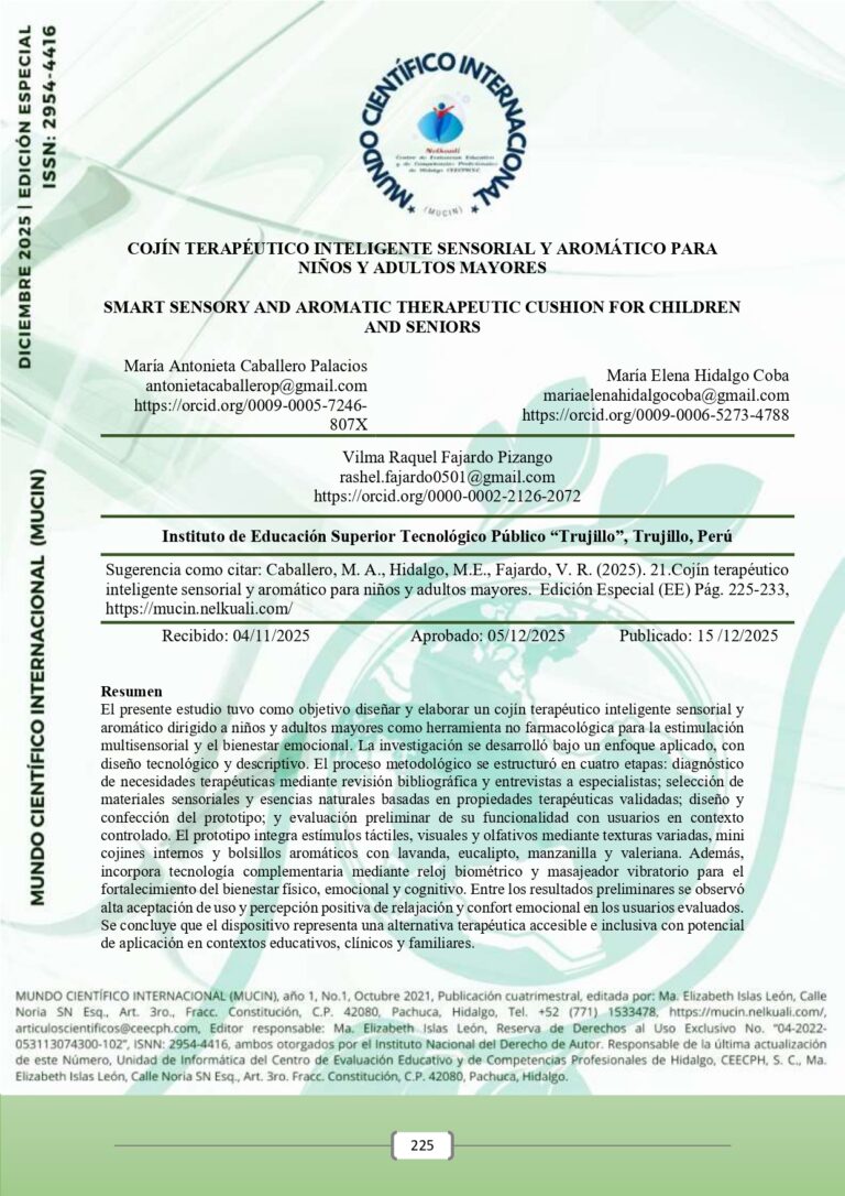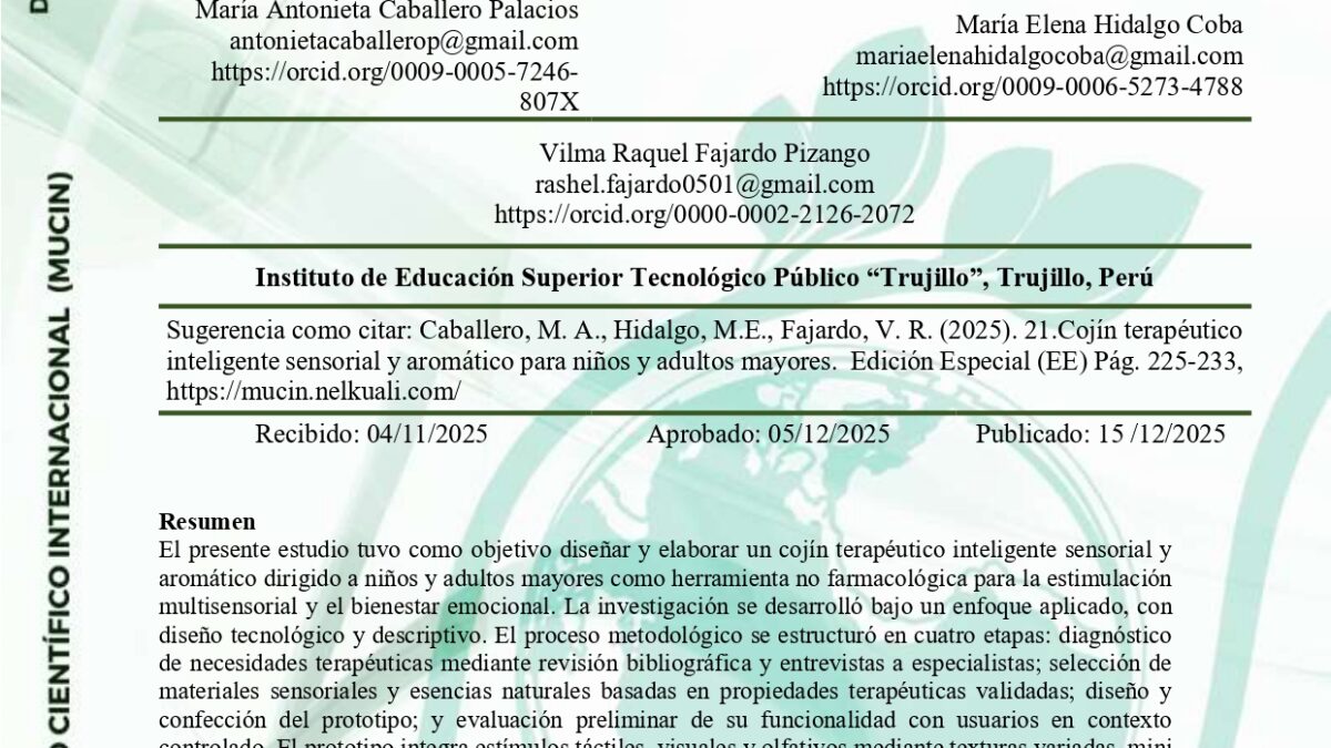 El presente estudio tuvo como objetivo diseñar y elaborar un cojín terapéutico inteligente sensorial y aromático dirigido a niños y adultos mayores como herramienta no farmacológica para la estimulación multisensorial y el bienestar emocional. La investigación se desarrolló bajo un enfoque aplicado, con diseño tecnológico y descriptivo. El proceso metodológico se estructuró en cuatro etapas: diagnóstico de necesidades terapéuticas mediante revisión bibliográfica y entrevistas a especialistas; selección de materiales sensoriales y esencias naturales basadas en propiedades terapéuticas validadas; diseño y confección del prototipo; y evaluación preliminar de su funcionalidad con usuarios en contexto controlado. El prototipo integra estímulos táctiles, visuales y olfativos mediante texturas variadas, mini cojines internos y bolsillos aromáticos con lavanda, eucalipto, manzanilla y valeriana. Además, incorpora tecnología complementaria mediante reloj biométrico y masajeador vibratorio para el fortalecimiento del bienestar físico, emocional y cognitivo. Entre los resultados preliminares se observó alta aceptación de uso y percepción positiva de relajación y confort emocional en los usuarios evaluados. Se concluye que el dispositivo representa una alternativa terapéutica accesible e inclusiva con potencial de aplicación en contextos educativos, clínicos y familiares.