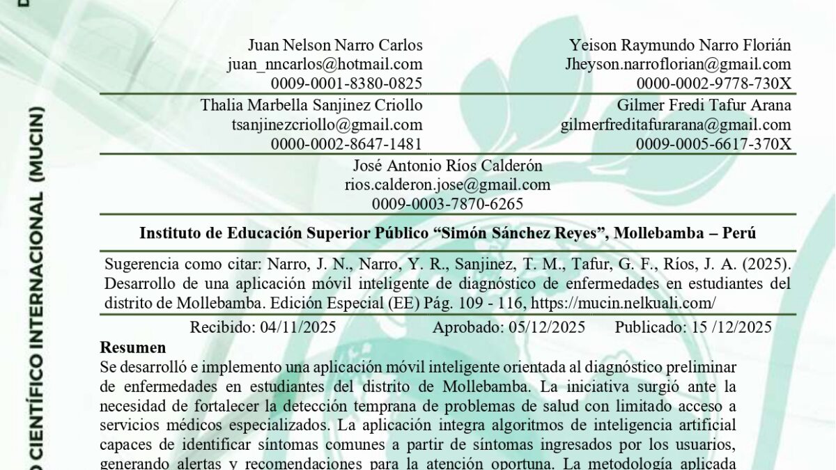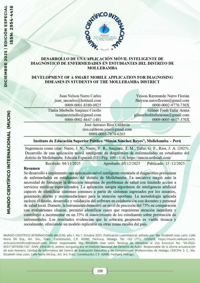 Se desarrolló e implemento una aplicación móvil inteligente orientada al diagnóstico preliminar de enfermedades en estudiantes del distrito de Mollebamba. La iniciativa surgió ante la necesidad de fortalecer la detección temprana de problemas de salud con limitado acceso a servicios médicos especializados. La aplicación integra algoritmos de inteligencia artificial capaces de identificar síntomas comunes a partir de síntomas ingresados por los usuarios, generando alertas y recomendaciones para la atención oportuna. La metodología aplicada incluyó el diseño, desarrollo y validación del software en colaboración con docentes y personal de salud local. Durante, la herramienta demostró un nivel de precisión del 75% en comparación con evaluaciones clínicas, permitió identificar casos que requirieran atención inmediata y contribuyó a incrementar en un 35% el conocimiento de los estudiantes sobre prevención de enfermedades. Los resultados evidencian que la solución propuesta es viable técnica y socialmente, ofreciendo un modelo replicable en otras zonas rurales del país.