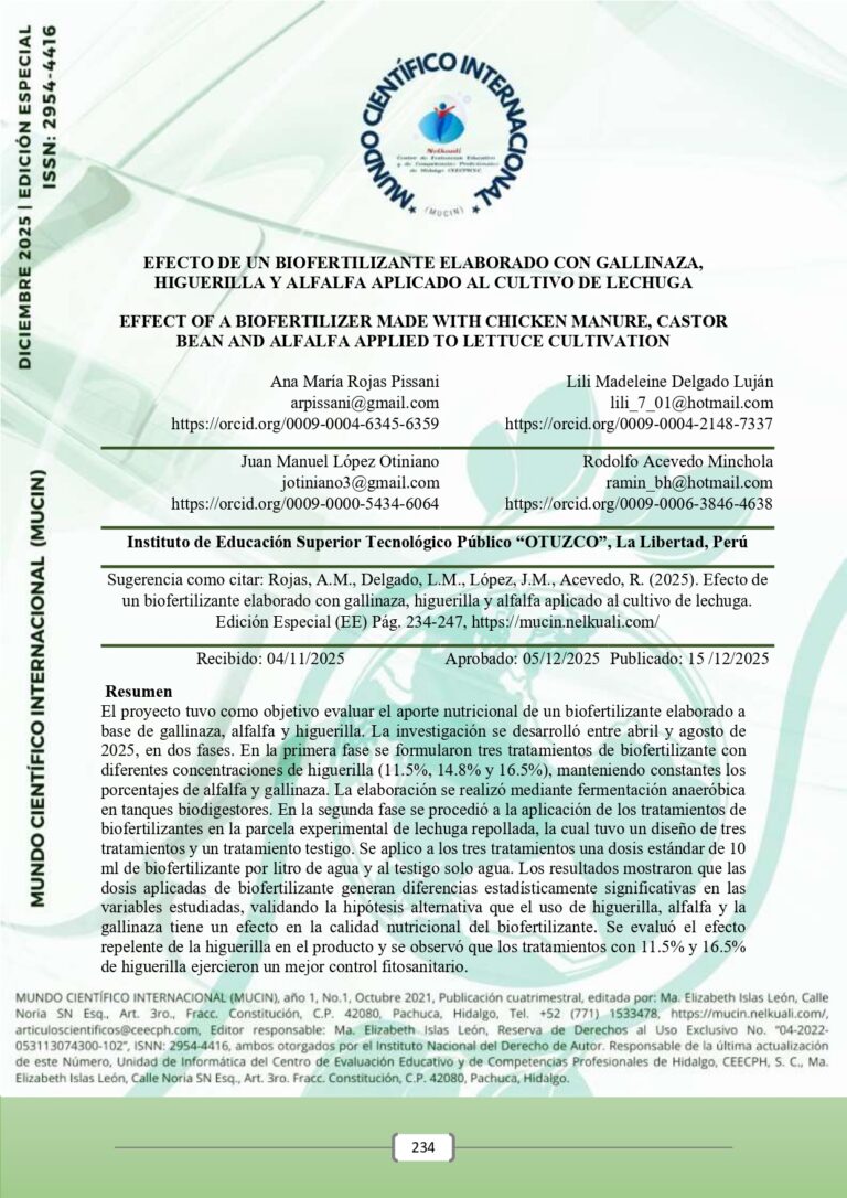 El proyecto tuvo como objetivo evaluar el aporte nutricional de un biofertilizante elaborado a base de gallinaza, alfalfa y higuerilla. La investigación se desarrolló entre abril y agosto de 2025, en dos fases. En la primera fase se formularon tres tratamientos de biofertilizante con diferentes concentraciones de higuerilla (11.5%, 14.8% y 16.5%), manteniendo constantes los porcentajes de alfalfa y gallinaza. La elaboración se realizó mediante fermentación anaeróbica en tanques biodigestores. En la segunda fase se procedió a la aplicación de los tratamientos de biofertilizantes en la parcela experimental de lechuga repollada, la cual tuvo un diseño de tres tratamientos y un tratamiento testigo. Se aplico a los tres tratamientos una dosis estándar de 10 ml de biofertilizante por litro de agua y al testigo solo agua. Los resultados mostraron que las dosis aplicadas de biofertilizante generan diferencias estadísticamente significativas en las variables estudiadas, validando la hipótesis alternativa que el uso de higuerilla, alfalfa y la gallinaza tiene un efecto en la calidad nutricional del biofertilizante. Se evaluó el efecto repelente de la higuerilla en el producto y se observó que los tratamientos con 11.5% y 16.5% de higuerilla ejercieron un mejor control fitosanitario.