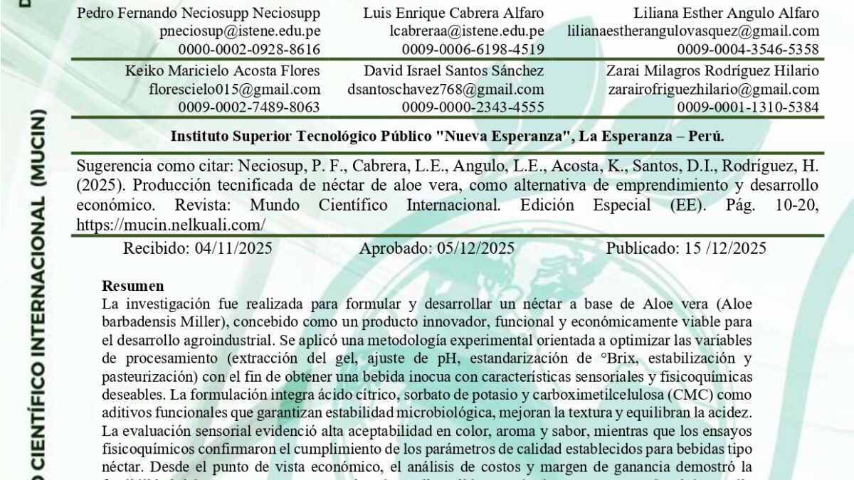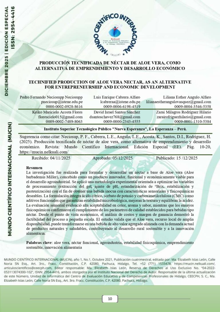 La investigación fue realizada para formular y desarrollar un néctar a base de Aloe vera (Aloe barbadensis Miller), concebido como un producto innovador, funcional y económicamente viable para el desarrollo agroindustrial. Se aplicó una metodología experimental orientada a optimizar las variables de procesamiento (extracción del gel, ajuste de pH, estandarización de °Brix, estabilización y pasteurización) con el fin de obtener una bebida inocua con características sensoriales y fisicoquímicas deseables. La formulación integra ácido cítrico, sorbato de potasio y carboximetilcelulosa (CMC) como aditivos funcionales que garantizan estabilidad microbiológica, mejoran la textura y equilibran la acidez. La evaluación sensorial evidenció alta aceptabilidad en color, aroma y sabor, mientras que los ensayos fisicoquímicos confirmaron el cumplimiento de los parámetros de calidad establecidos para bebidas tipo néctar. Desde el punto de vista económico, el análisis de costos y margen de ganancia demostró la factibilidad del proceso a pequeña escala. El estudio valida que el Aloe vera, recurso local de amplia disponibilidad, puede transformarse en una bebida de alto valor agregado alineada con la demanda actual de productos naturales y saludables, contribuyendo al desarrollo rural sostenible y a la innovación alimentaria.