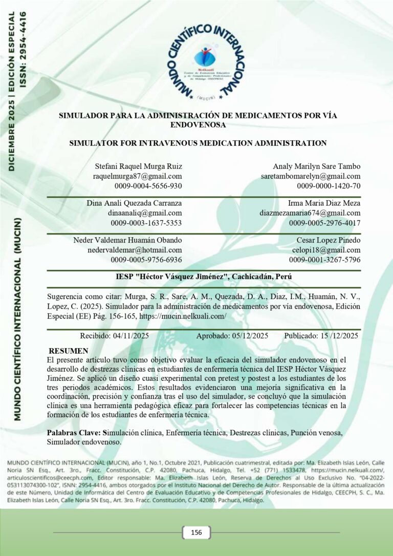 El presente artículo tuvo como objetivo evaluar la eficacia del simulador endovenoso en el desarrollo de destrezas clínicas en estudiantes de enfermería técnica del IESP Héctor Vásquez Jiménez. Se aplicó un diseño cuasi experimental con pretest y postest a los estudiantes de los tres periodos académicos. Estos resultados evidenciaron una mejoría significativa en la coordinación, precisión y confianza tras el uso del simulador, se concluyó que la simulación clínica es una herramienta pedagógica eficaz para fortalecer las competencias técnicas en la formación de los estudiantes de enfermería técnica.