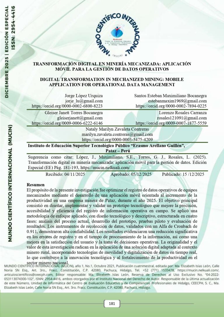 El propósito de la presente investigación fue optimizar el registro de datos operativos de equipos mecanizados mediante el desarrollo de una aplicación móvil orientada al incremento de la productividad en una empresa minera de Pataz, durante el año 2025. El objetivo principal consistió en diseñar, implementar y validar un prototipo tecnológico que mejore la precisión, accesibilidad y eficiencia del registro de información operativa en campo. Se aplicó una metodología de enfoque aplicado, con diseño tecnológico y descriptivo, estructurada en cuatro fases: análisis del proceso actual, desarrollo del prototipo, pruebas piloto y evaluación de resultados. Los instrumentos de recolección de datos, validados con un Alfa de Cronbach de 0.911, demostraron alta confiabilidad. Los resultados evidenciaron una reducción significativa en los errores de registro y en el tiempo de procesamiento de la información, así como una mejora en la satisfacción del usuario y la toma de decisiones operativas. La originalidad y el valor de esta investigación radican en la aplicación de una solución digital adaptada al contexto minero rural, incorporando tecnologías de movilidad y digitalización de datos en tiempo real, lo que contribuye a la innovación tecnológica y al fortalecimiento de la productividad en el sector minero nacional.