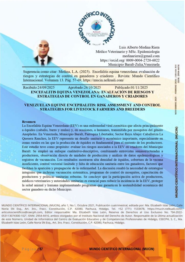ISSN: 2954-4416 CONSULTAR DOI: 10.59333/MUCIN.13.5 Editor General: Ramón Hernández de Jesus PhD. Co-editora: Elizabeth Islas León, PhD. PDF 5. ENCEFALITIS EQUINA VENEZOLANA: EVALUACIÓN DE RIESGOS Y ESTRATEGIAS DE CONTROL EN GANADEROS Y CRIADORES Resumen La Encefalitis Equina Venezolana (EEV) es una enfermedad viral zoonótica que…