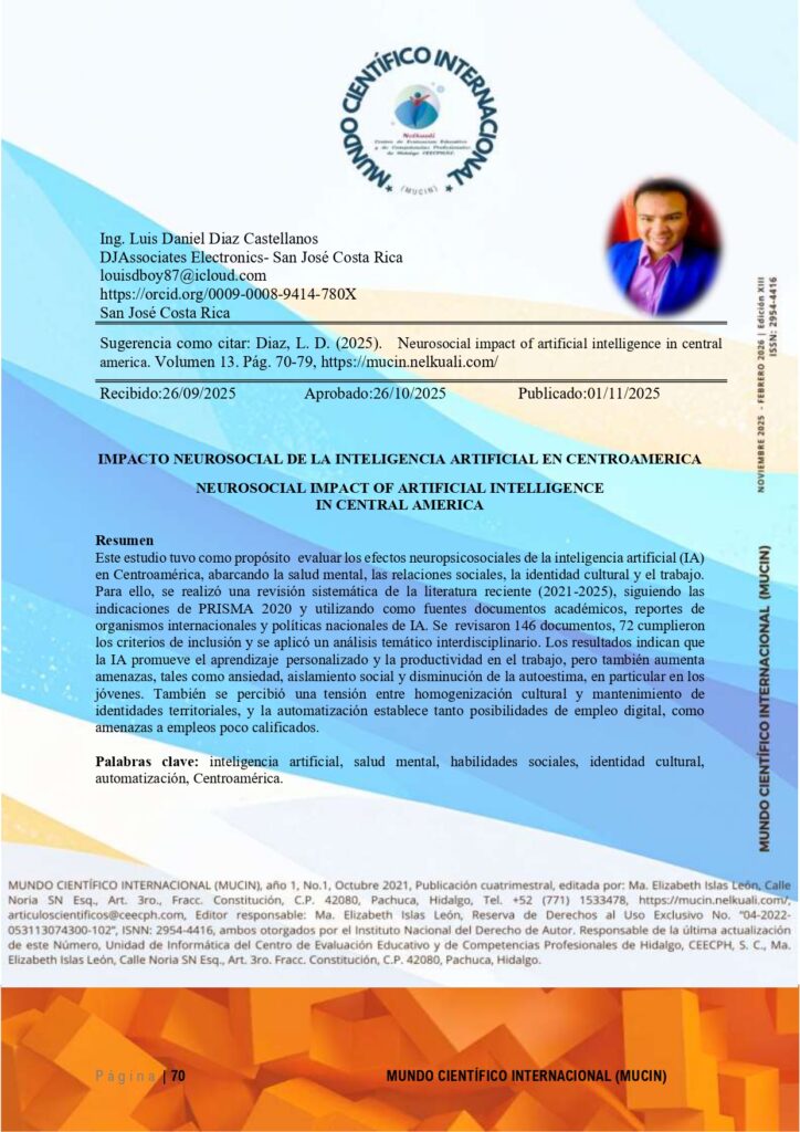 ISSN: 2954-4416 CONSULTAR DOI:10.59333/MUCIN.E13.6 Editor General: Ramón Hernández de Jesus PhD. Co-editora: Elizabeth Islas León, PhD. PDF 6. IMPACTO NEUROSOCIAL DE LA INTELIGENCIA ARTIFICIAL EN CENTROAMÉRICA Resumen Este estudio tuvo como propósito evaluar los efectos neuropsicosociales de la inteligencia artificial (IA) en Centroamérica, abarcando la salud…