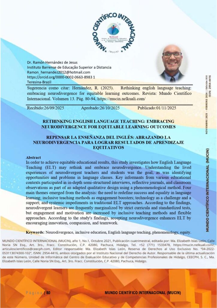 ISSN: 2954-4416 CONSULTAR DOI:10.59333/MUCIN.E13.7 Editor General: Ramón Hernández de Jesus PhD. Co-editora: Elizabeth Islas León, PhD. PDF 7. RETHINKING ENGLISH LANGUAGE TEACHING: EMBRACING NEURODIVERGENCE FOR EQUITABLE LEARNING OUTCOMES Abstract In order to achieve equitable educational results, this study investigates how English Language Teaching (ELT) may…