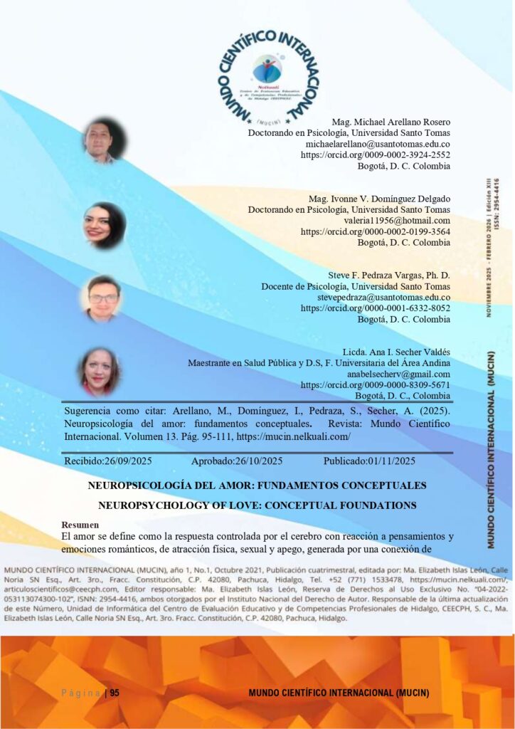 ISSN: 2954-4416 CONSULTAR DOI:10.59333/MUCIN.E13.8 Editor General: Ramón Hernández de Jesus PhD. Co-editora: Elizabeth Islas León, PhD. PDF 8. NEUROPSICOLOGÍA DEL AMOR: FUNDAMENTOS CONCEPTUALES. Resumen El amor se define como la respuesta controlada por el cerebro con reacción a pensamientos y emociones románticos, de atracción física,…