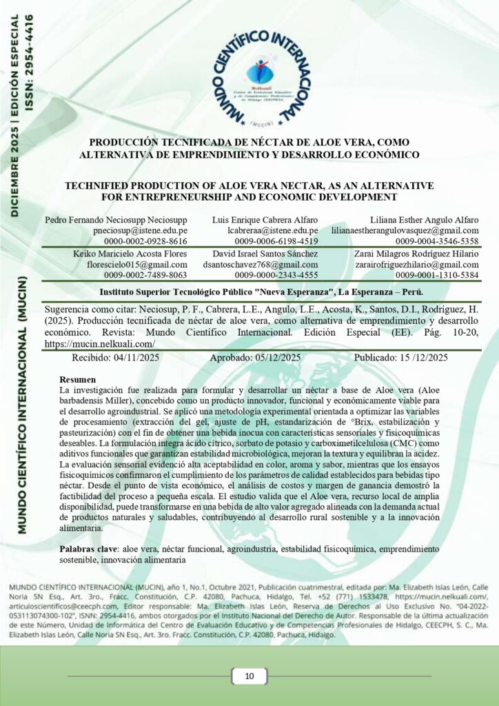 ISSN: 2954-4416 CONSULTAR DOI: 10.59333/MUCIN.ESPECIAL1.1 Editor General: Ramón Hernández de Jesus PhD. Co-editora: Elizabeth Islas León, PhD. PDF PRODUCCIÓN TECNIFICADA DE NÉCTAR DE ALOE VERA, COMO ALTERNATIVA DE EMPRENDIMIENTO Y DESARROLLO ECONÓMICO Resumen La investigación fue realizada para formular y desarrollar un néctar a base…