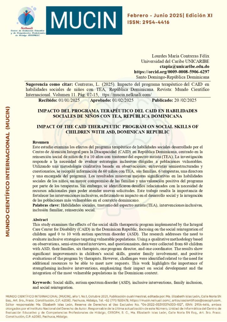 ISSN: 2954-4416 CONSULTARA DOI: 10.59333/MUCIN.E11.1 Editor General: Ramón Hernández de Jesus PhD. Co-editora: Elizabeth Islas León, PhD. PDF Impacto del programa terapéutico del CAID en habilidades sociales de niños con TEA, República Dominicana. Resumen Este estudio examina los efectos del programa terapéutico de habilidades sociales…