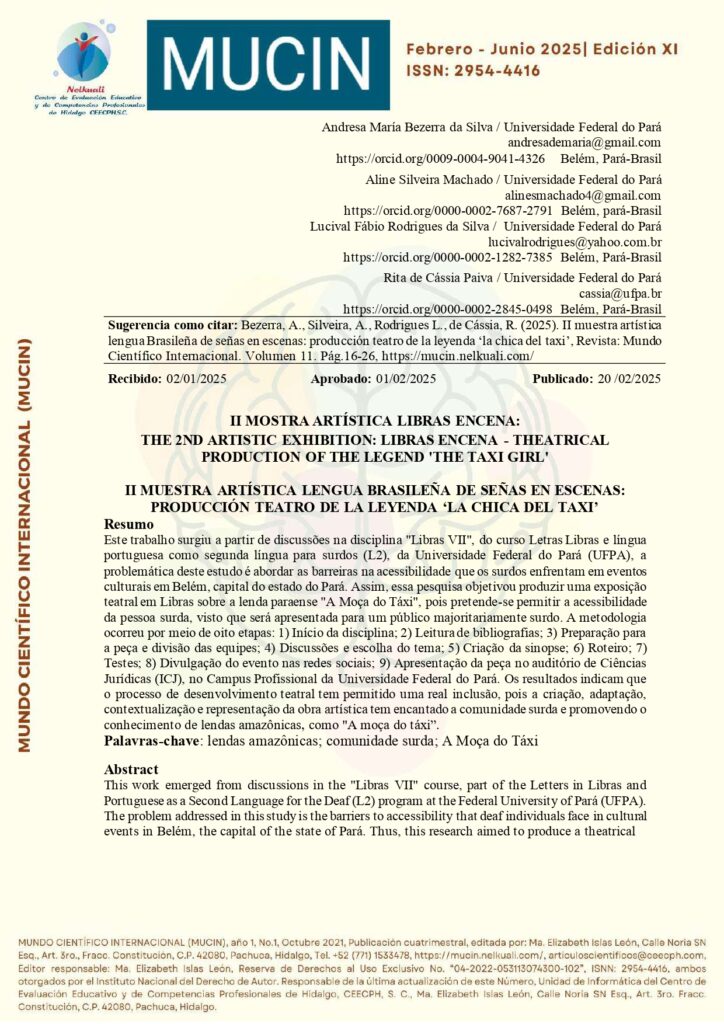 ISSN: 2954-4416 CONSULTAR DOI: 10.59333/MUCIN.E11.2 Editor General: Ramón Hernández de Jesus PhD. Co-editora: Elizabeth Islas León, PhD. PDF II Muestra artística lengua brasileña de señas en escenas: producción teatro de la leyenda ‘la chica del taxi’ Resumo Este trabalho surgiu a partir de discussões na…